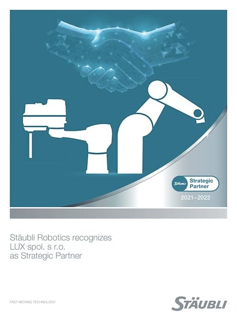 Děkujeme tímto firmě Stäubli za přizvání a možnost prezentovat jak firmu LUX, tak i konkrétní robotické aplikace. Spolupráce se Stäubli byla stvrzena plaketou pro strategického partnera.