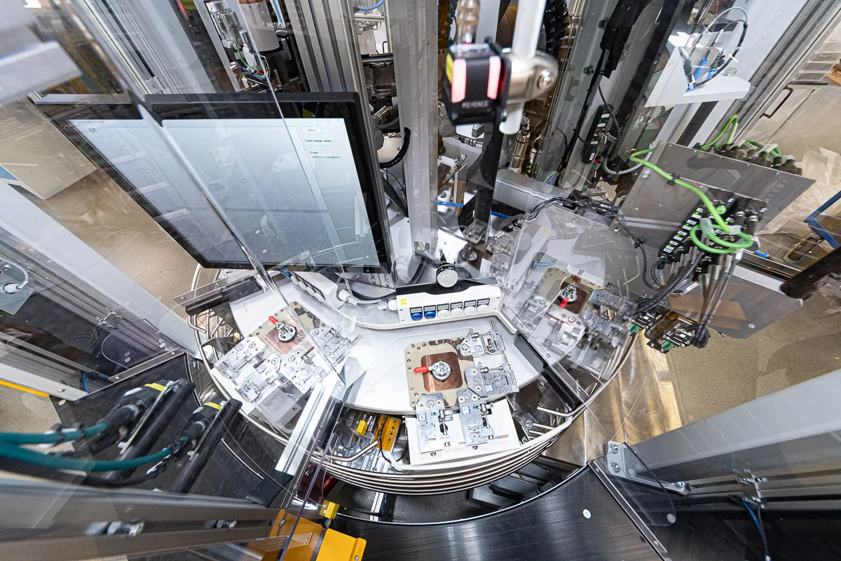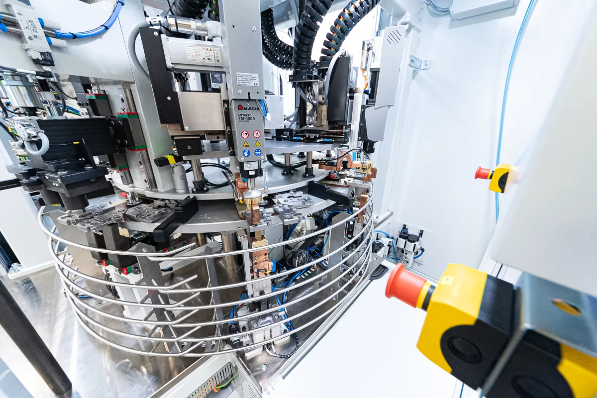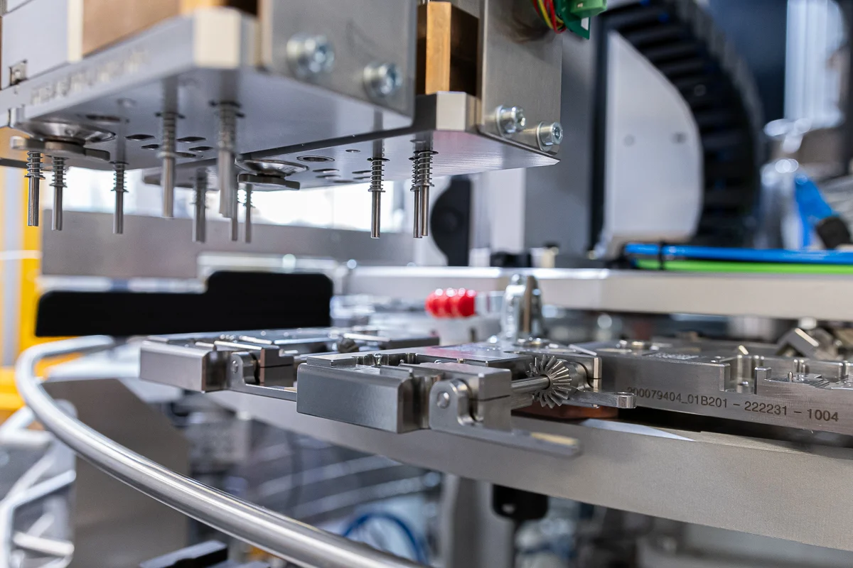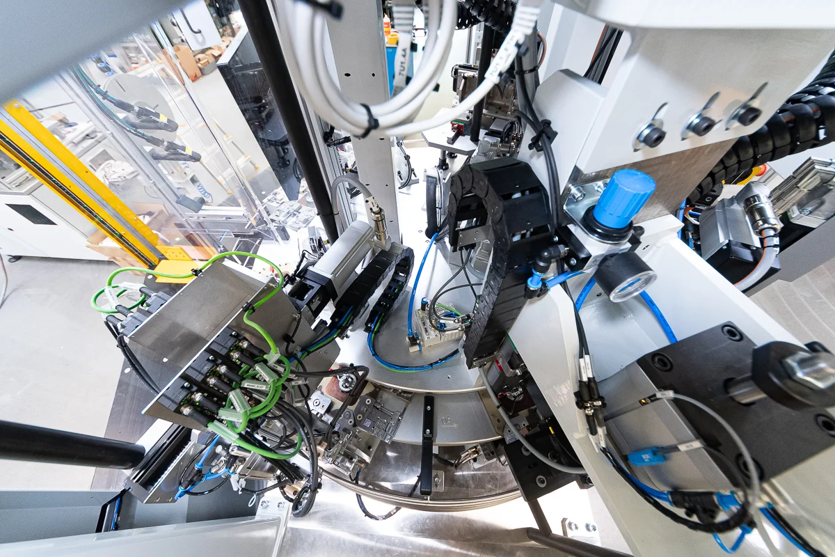 Obsluha ručně zakládá vstupní díly do zakládacích lůžek karuselu. Ostatní díly jsou do stroje podávány automaticky pomocí vibračních podavačů. Po odeslání lůžek do karuselu dojde k laserovému značení a plně automatické montáži produktu. Postupně jsou díly smontovány do sebe. Na montáži se podílí i šestiosý robot.