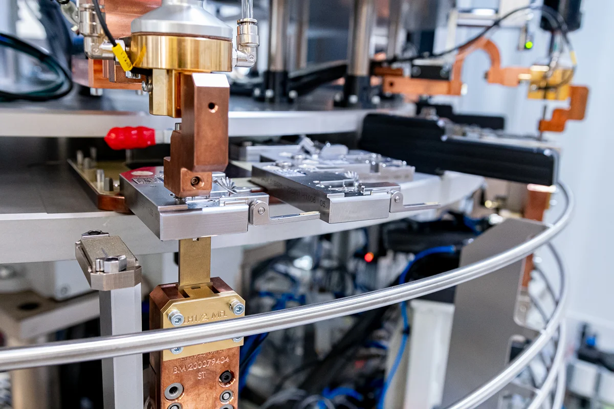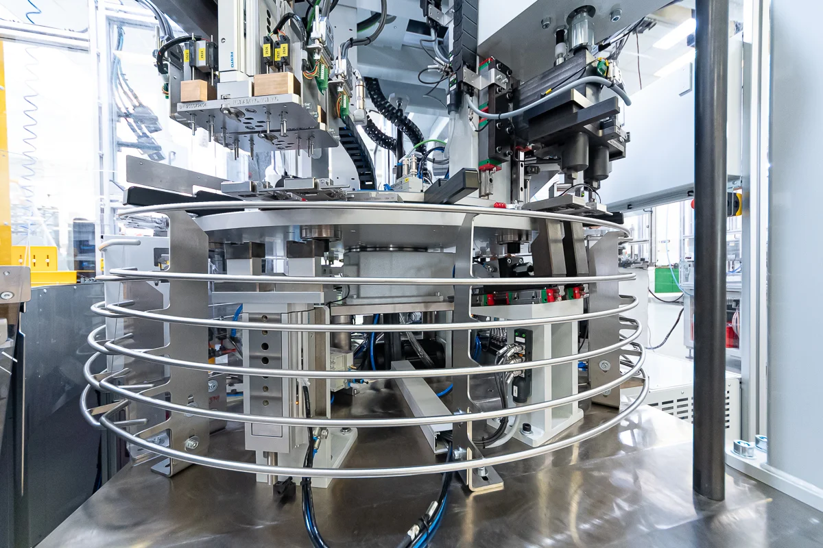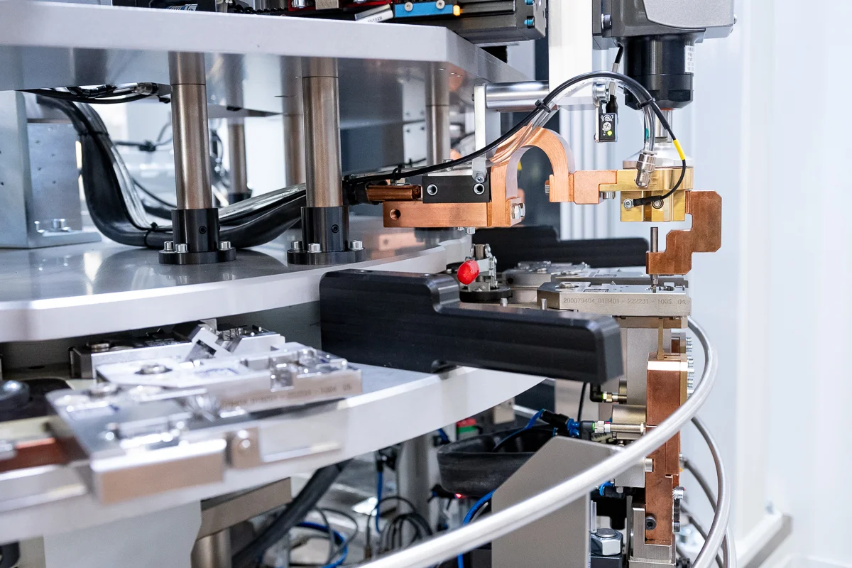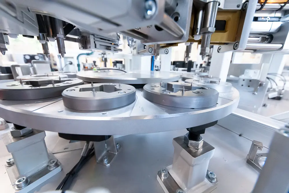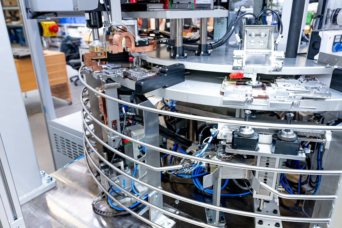 Obsluha ručně zakládá vstupní díly do zakládacích lůžek karuselu. Ostatní díly jsou do stroje podávány automaticky pomocí vibračních podavačů. Po odeslání lůžek do karuselu dojde k laserovému značení a plně automatické montáži produktu. Postupně jsou díly smontovány do sebe. Na montáži se podílí i šestiosý robot.